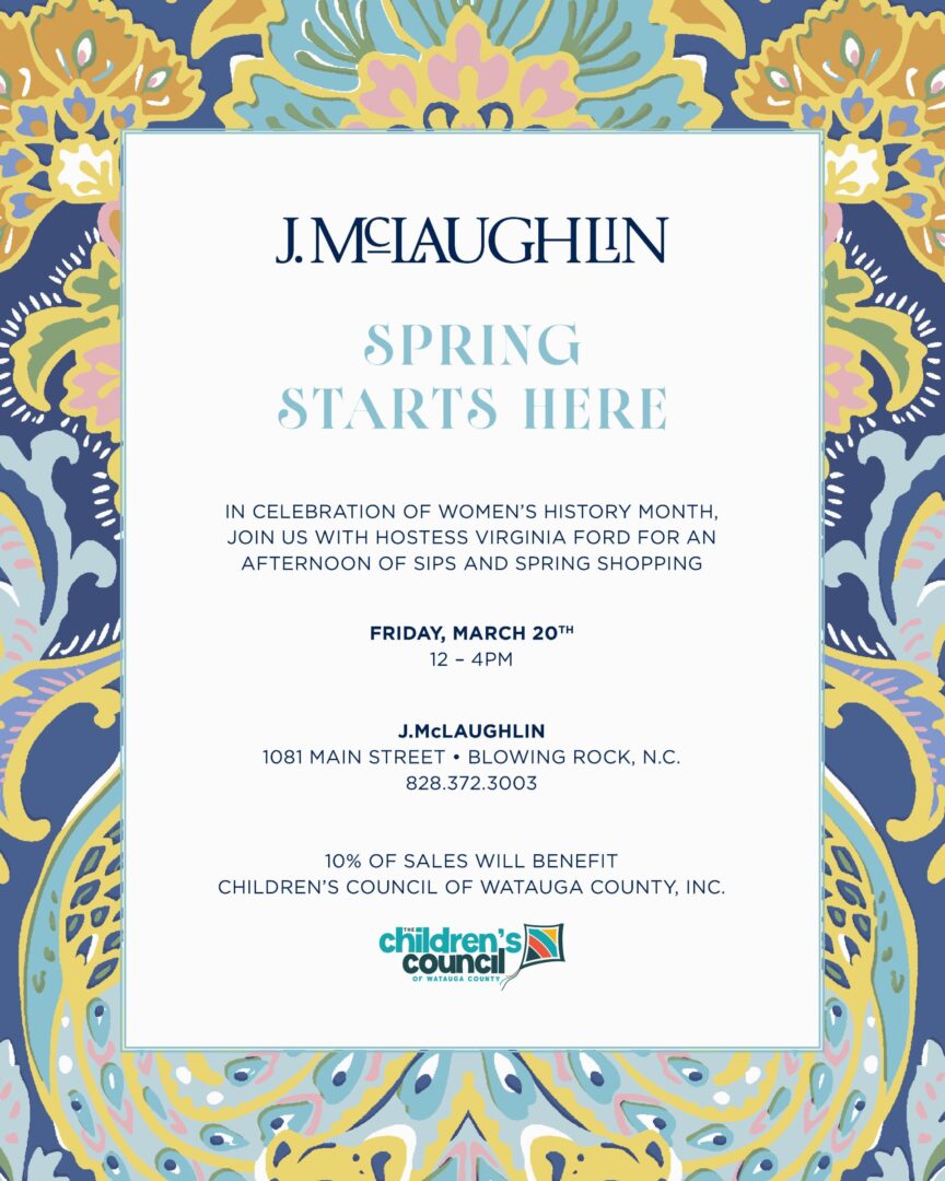 JMcLaughlin and your hostess, Virginia Ford of the Children’s Council, would like to invite you to shop for a cause. 10% of the proceeds will benefit The Children’s Council of Watauga County.  Their mission is to build strong foundations for children’s learning and development by strengthening families, the early childhood system, and the wider community. Come enjoy some light bites and sips as you stroll through JMcLaughlin’s new Spring Collection.  If you would love to support but are unable to attend no worries, please call and JMcLaughlin will order all items and ship to you (shipping is on them). Save the date: Friday March 20th 12pm-4pm!