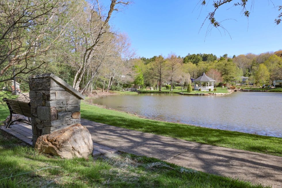 The Blowing Rock History Walk begins on Laurel Lane at the intersection of Laurel Lane and Main St. The walk then heads down Laurel Lane and goes around Broyhill Park. The trail is paved and handicap accessible. Broyhill Park is a lovely park with a gazebo and a pond with a fountain. The History Walk is marked with stone pillars that have bronze plaques on them. On the plaques is an engraving, a relief picture, and a QR code that links to more backstory and information. These monuments share a place, person, or moment in history that was important to the town of Blowing Rock. The walk is peppered with benches for sitting, relaxing, and taking in the scenery.