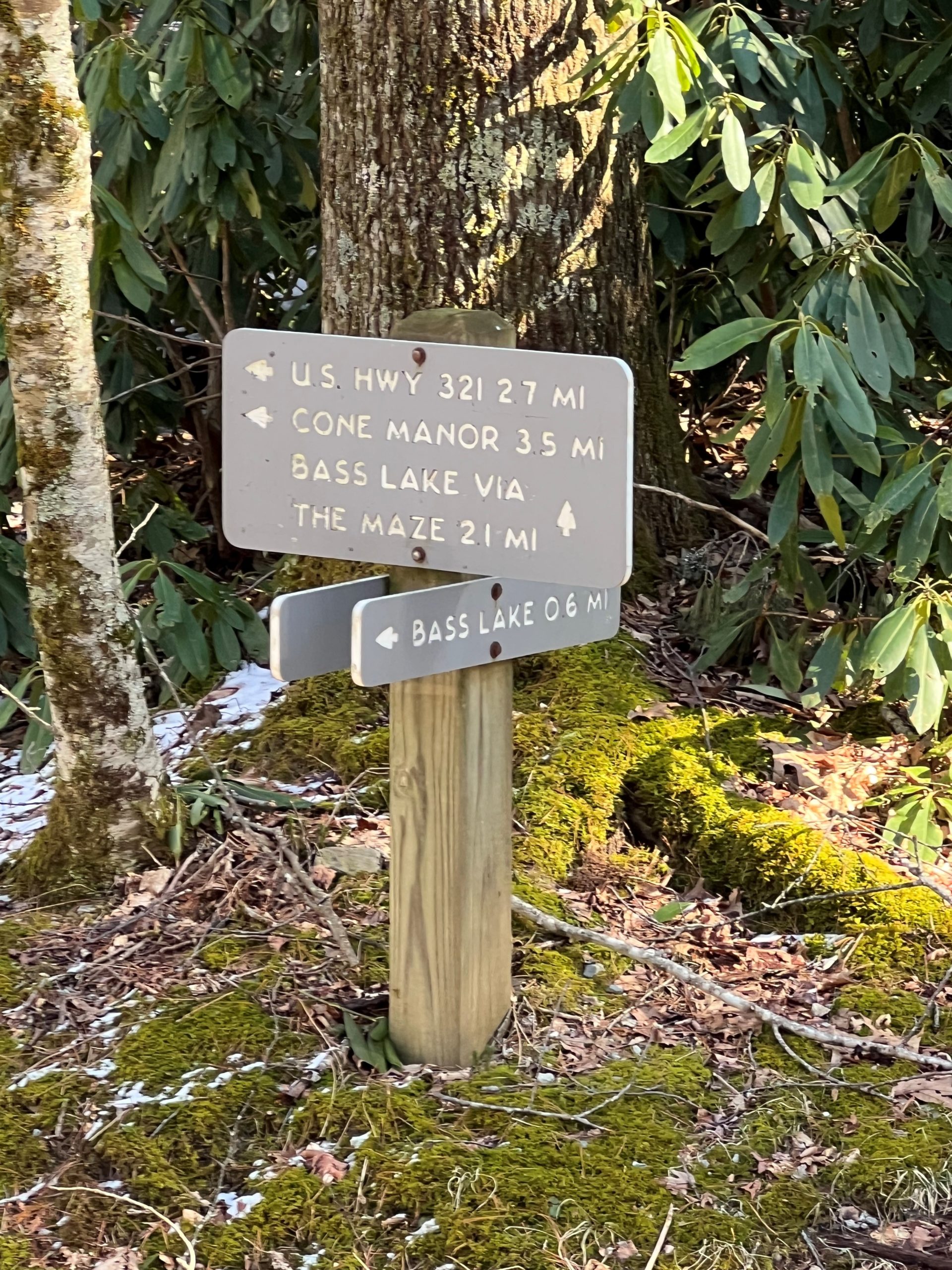 To get there from Blowing Rock, take 221 towards Linville. Before you exit Blowing Rock, there will be a turn off for Bass Lake on the right. Turn off and park in the parking area. The lake is a loop so the trail can be accessed from either side, however, it may be faster to start to the left and access it from there. The turn off for the Maze is located on the left and goes over a bridge with a waterfall before starting in earnest. It is marked with a sign as well.